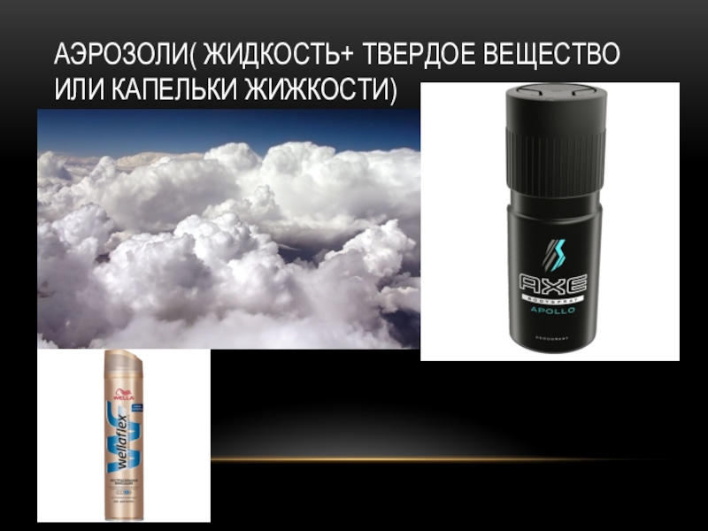 Слайд 9Аэрозоли( жидкость+ твердое вещество или капельки жижкости)