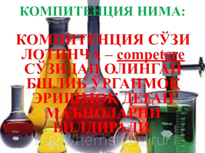 КОМПИТЕНЦИЯ НИМА:КОМПИТЕНЦИЯ СЎЗИ ЛОТИНЧА – competere СЎЗИДАН ОЛИНГАН БШЛИБ ЎРГАНМОҚ ЭРИШМОҚ ДЕГАН МАЪНОЛАРНИ БИЛДИРАДИ.