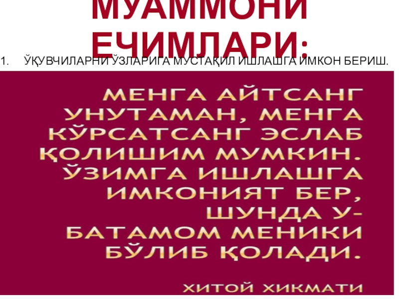 МУАММОНИ ЕЧИМЛАРИ:ЎҚУВЧИЛАРНИ ЎЗЛАРИГА МУСТАҚИЛ ИШЛАШГА ИМКОН БЕРИШ.
