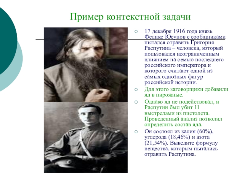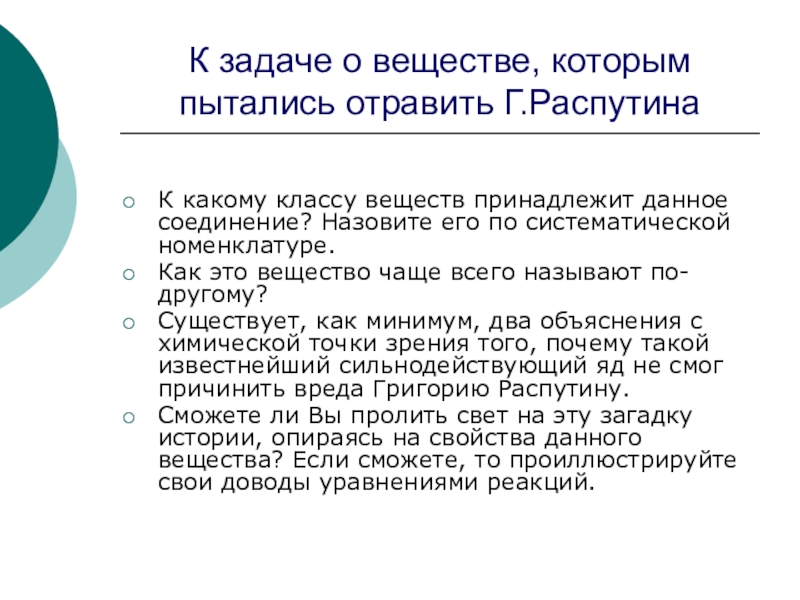 Слайд 10К задаче о веществе, которым пытались отравить Г.Распутина