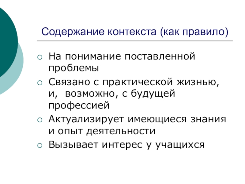Контекстное обучение - это организация такой деятельности, которая требует приобретения новых знаний и их последующего применения, объясняет и оправдывает усилия, затраченные на их усвоение.