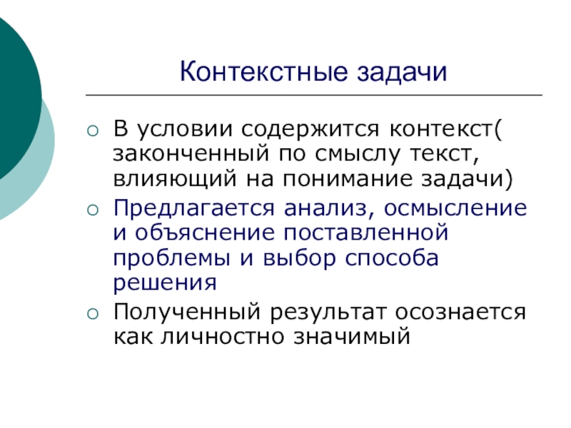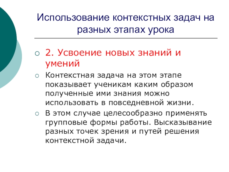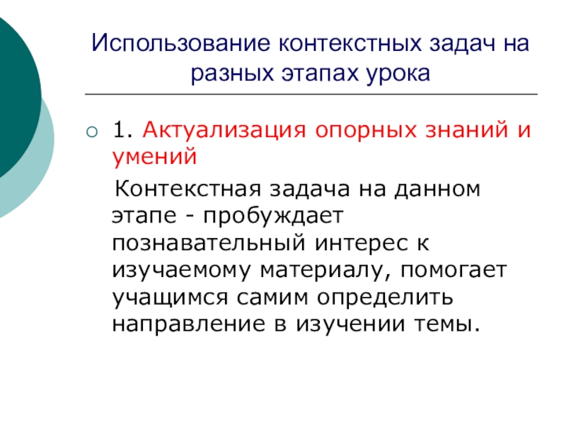 На этих этапах урока контекстные задачи позволяют учащимся самостоятельно обобщить изучаемый материал и определить направления в дальнейшем его изучении.