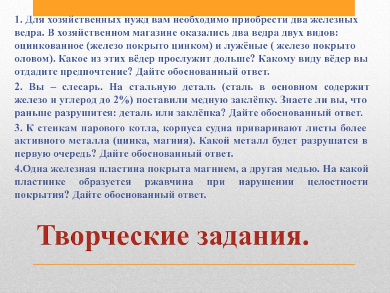 В хозяйственном магазине оказались два ведра двух видов: оцинкованное (железо покрыто цинком) и лужёные ( железо покрыто оловом). Какое из этих вёдер прослужит дольше? Какому виду вёдер вы отдадите предпочтение? Дайте обоснованный ответ.