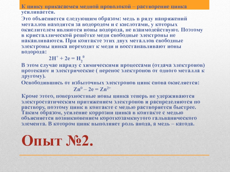 Кроме этого, поверхностные ионы цинка теперь не удерживаются электростатическим притяжением электронов и распределяются по раствору, поэтому цинк в контакте с медью растворяется быстрее. Таким образом, усиление коррозии цинка в контакте с медью объясняется возникновением короткозамкнутого гальванического элемента. В котором цинк выполняет роль анода, а медь – катода.