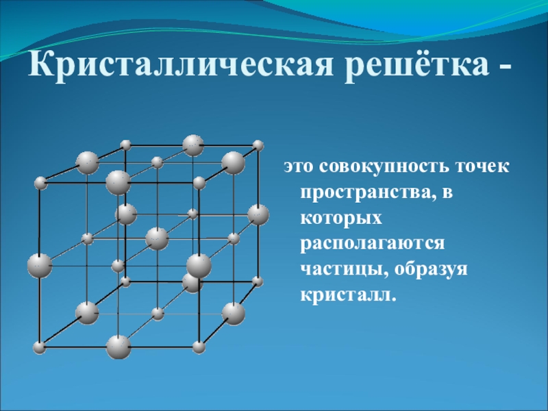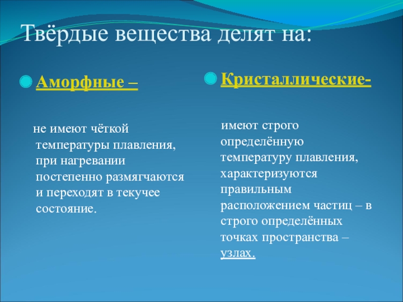 имеют строго определённую температуру плавления, характеризуются правильным расположением частиц – в строго определённых точках пространства – узлах.