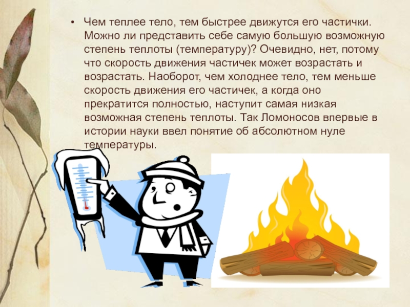 себе самую большую возможную степень теплоты (температуру)? Очевидно, нет, потому что скорость движения частичек может возрастать и возрастать. Наоборот, чем холоднее тело, тем меньше скорость движения его частичек, а когда оно прекратится полностью, наступит самая низкая возможная степень теплоты. Так Ломоносов впервые в истории науки ввел понятие об абсолютном нуле температуры.