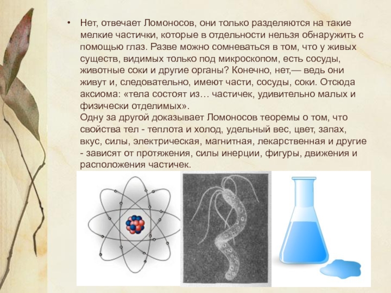 Слайд 5Нет, отвечает Ломоносов, они только разделяются на такие мелкие частички, которые