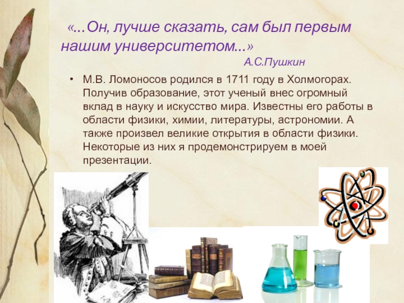 М.В. Ломоносов родился в 1711 году в Холмогорах. Получив образование, этот ученый внес огромный вклад в науку и искусство мира. Известны его работы в области физики, химии, литературы, астрономии. А также произвел великие открытия в области физики. Некоторые из них я продемонстрируем в моей презентации.