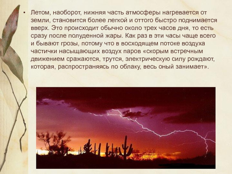 и оттого быстро поднимается вверх. Это происходит обычно около трех часов дня, то есть сразу после полуденной жары. Как раз в эти часы чаще всего и бывают грозы, потому что в восходящем потоке воздуха частички насыщающих воздух паров «скорым встречным движением сражаются, трутся, электрическую силу рождают, которая, распространяясь по облаку, весь оный занимает».