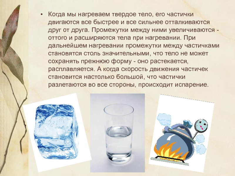 все сильнее отталкиваются друг от друга. Промежутки между ними увеличиваются - оттого и расширяются тела при нагревании. При дальнейшем нагревании промежутки между частичками становятся столь значительными, что тело не может сохранять прежнюю форму - оно растекается, расплавляется. А когда скорость движения частичек становится настолько большой, что частички разлетаются во все стороны, происходит испарение.