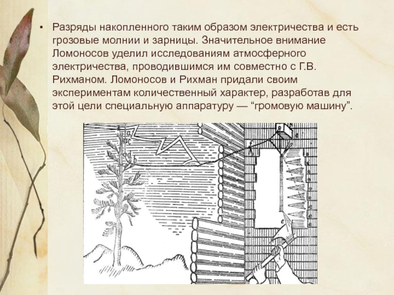 Значительное внимание Ломоносов уделил исследованиям атмосферного электричества, проводившимся им совместно с Г.В. Рихманом. Ломоносов и Рихман придали своим экспериментам количественный характер, разработав для этой цели специальную аппаратуру — “громовую машину”.