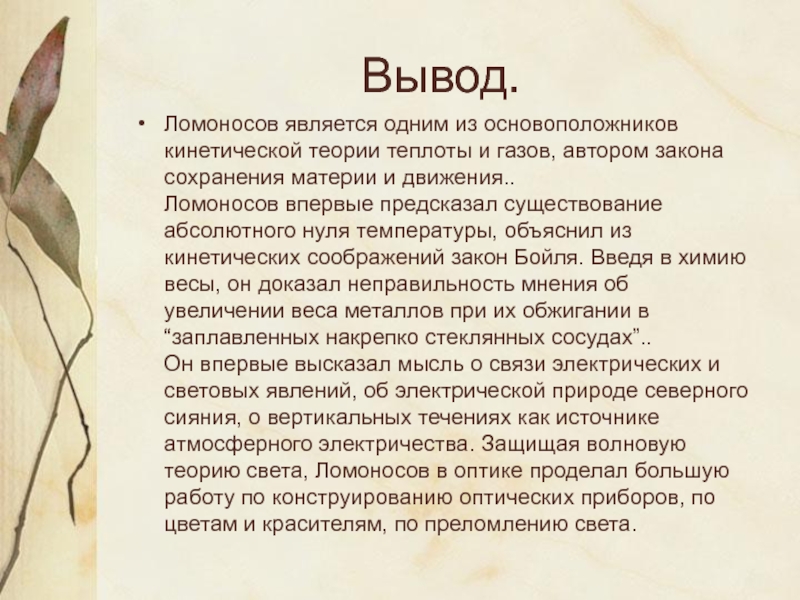Ломоносов впервые предсказал существование абсолютного нуля температуры, объяснил из кинетических соображений закон Бойля. Введя в химию весы, он доказал неправильность мнения об увеличении веса металлов при их обжигании в “заплавленных накрепко стеклянных сосудах”..