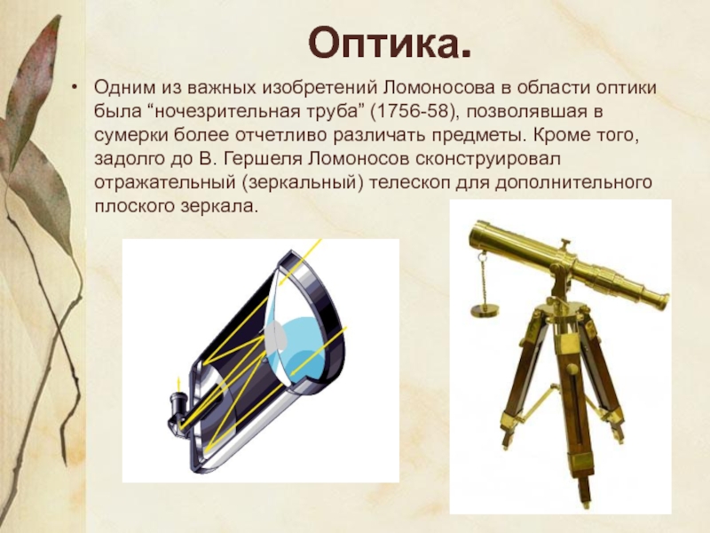 (1756-58), позволявшая в сумерки более отчетливо различать предметы. Кроме того, задолго до В. Гершеля Ломоносов сконструировал отражательный (зеркальный) телескоп для дополнительного плоского зеркала.