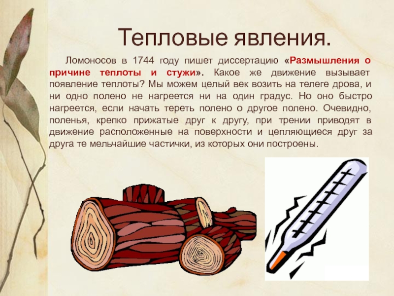 диссертацию «Размышления о причине теплоты и стужи». Какое же движение вызывает появление теплоты? Мы можем целый век возить на телеге дрова, и ни одно полено не нагреется ни на один градус. Но оно быстро нагреется, если начать тереть полено о другое полено. Очевидно, поленья, крепко прижатые друг к другу, при трении приводят в движение расположенные на поверхности и цепляющиеся друг за друга те мельчайшие частички, из которых они построены.