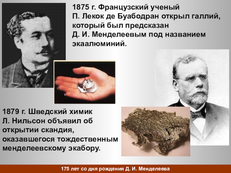 предсказал свойства и местоположение в периодической таблице ещё неоткрытых элементов (экаалюминий, экабор и др.).