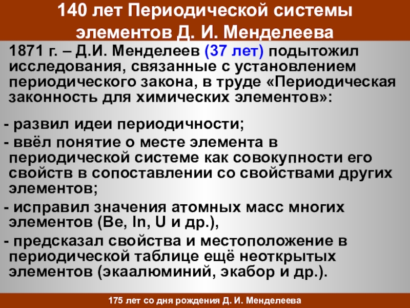 (37 лет) подытожил исследования, связанные с установлением периодического закона, в труде «Периодическая законность для химических элементов»: