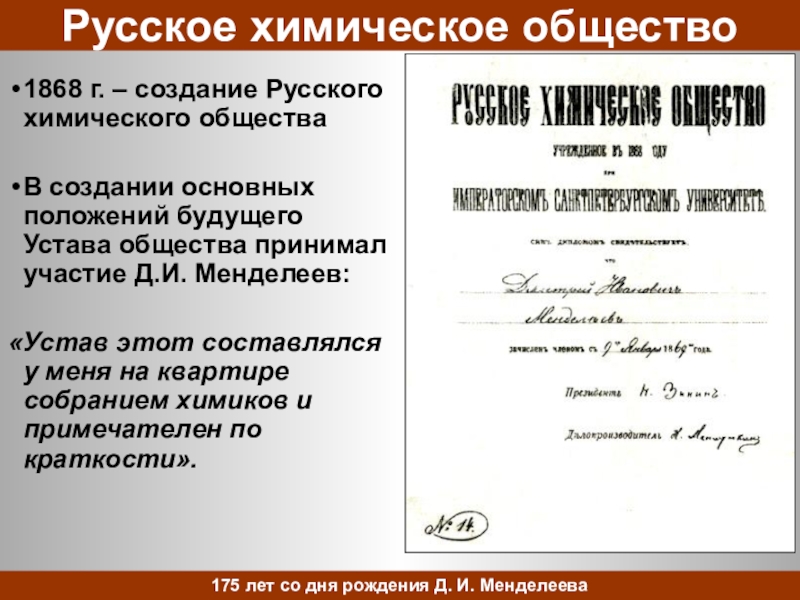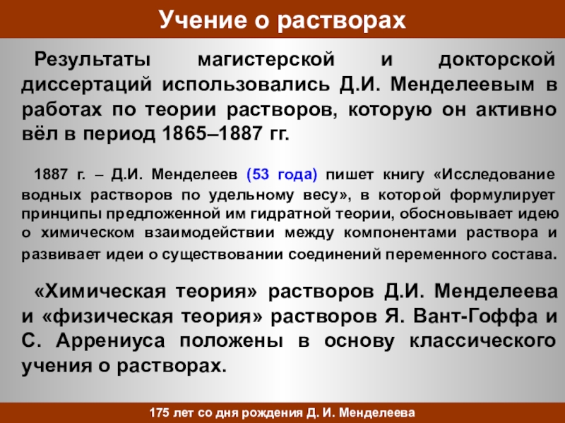 составили моё имя: периодический закон, исследование упругости газов, понимание растворов как ассоциаций и “Основы химии”» Д.И. Менделеев