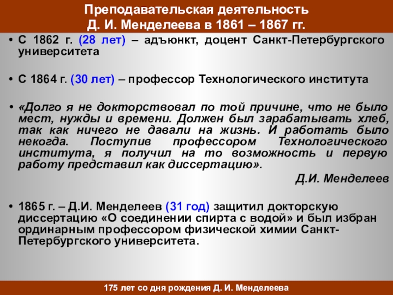 Преподавательская деятельность Д. И. Менделеева в 1861 – 1867 гг.С 1862 г. (28 лет) – адъюнкт, доцент