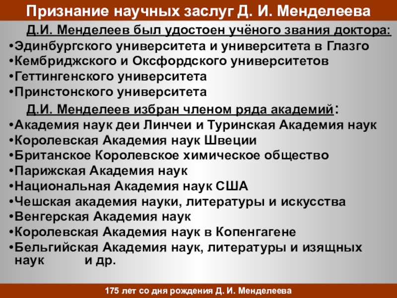 Признание научных заслуг Д. И. Менделеева	Д.И. Менделеев был удостоен учёного звания доктора:Эдинбургского университета и университета в ГлазгоКембриджского