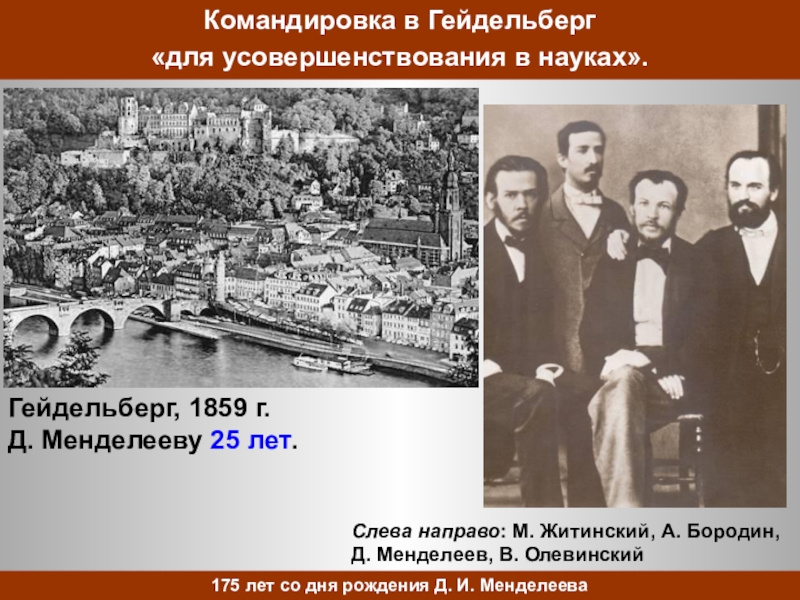 Гейдельберг, 1859 г.Д. Менделееву 25 лет.Слева направо: М. Житинский, А. Бородин, Д. Менделеев, В. ОлевинскийКомандировка в Гейдельберг«для