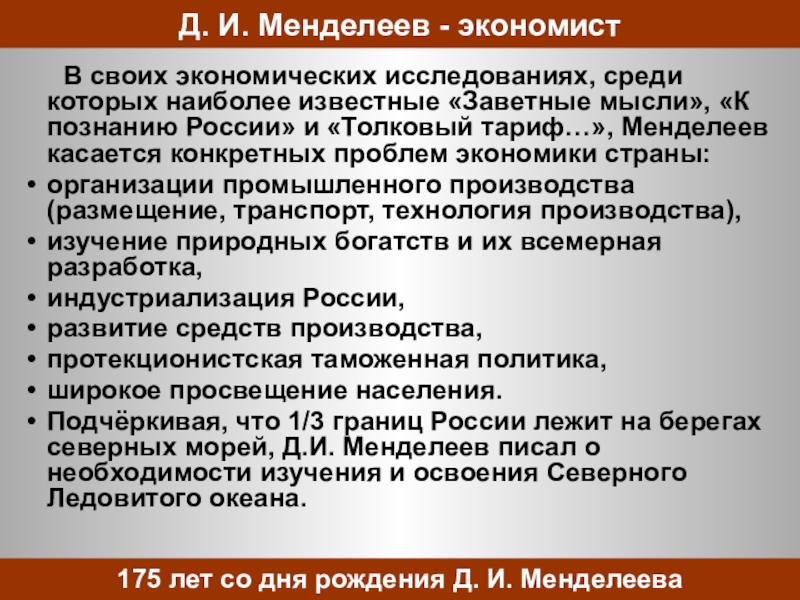 В своих экономических исследованиях, среди которых наиболее известные «Заветные мысли», «К познанию России» и «Толковый тариф…», Менделеев