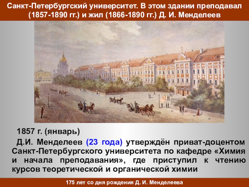 Д.И. Менделеев (23 года) утверждён приват-доцентом Санкт-Петербургского университета по кафедре «Химия и начала преподавания», где приступил к чтению курсов теоретической и органической химии