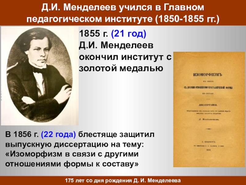 Д.И. Менделеев учился в Главном педагогическом институте (1850-1855 гг.)1855 г. (21 год)Д.И. Менделеев окончил институт с золотой