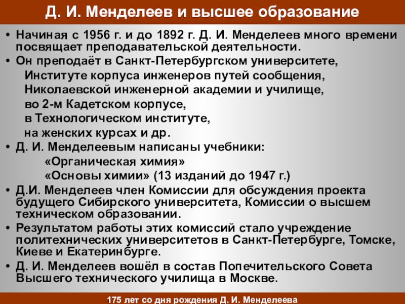 Начиная с 1956 г. и до 1892 г. Д. И. Менделеев много времени посвящает преподавательской деятельности. Он