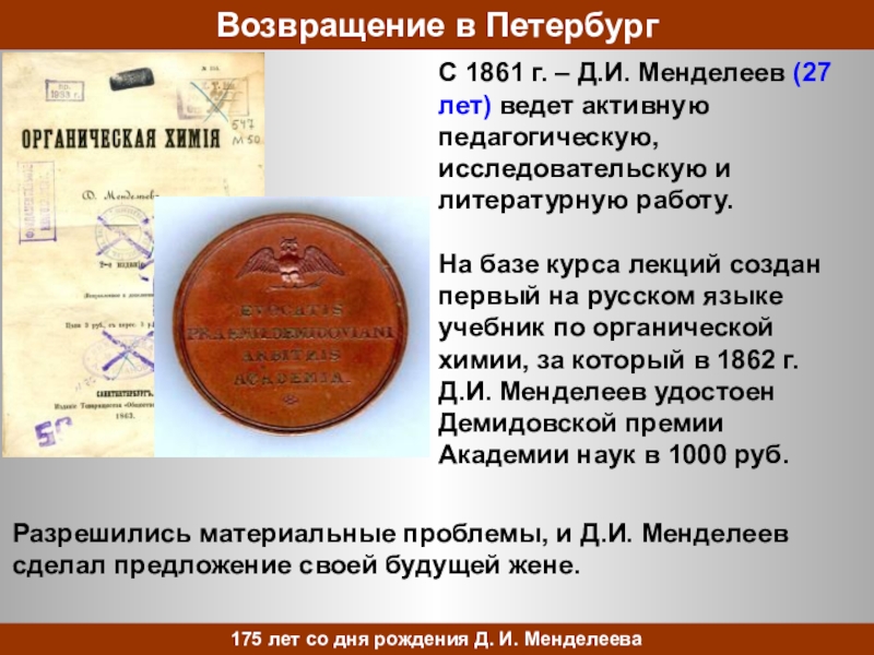 1861 г. – Д.И. Менделеев (27 лет) ведет активную педагогическую, исследовательскую и литературную работу.