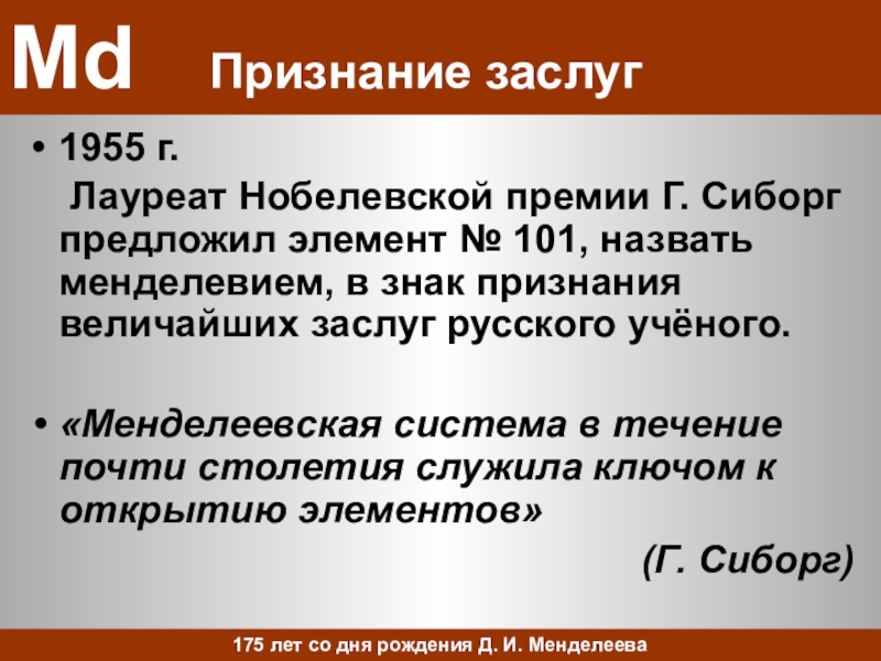Md		 Признание заслуг1955 г.	Лауреат Нобелевской премии Г. Сиборг предложил элемент № 101, назвать менделевием, в знак признания