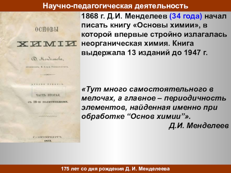 1868 г. Д.И. Менделеев (34 года) начал писать книгу «Основы химии», в которой впервые стройно излагалась неорганическая