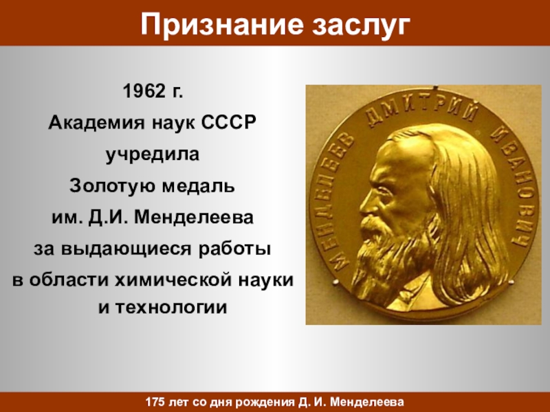 Признание заслуг1962 г.Академия наук СССРучредилаЗолотую медальим. Д.И. Менделееваза выдающиеся работыв области химической науки и технологии175 лет со