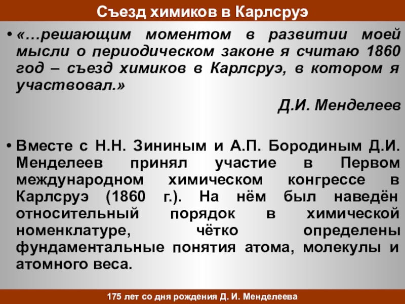 «…решающим моментом в развитии моей мысли о периодическом законе я считаю 1860 год – съезд химиков в