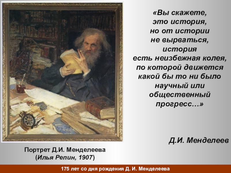 Портрет Д.И. Менделеева(Илья Репин, 1907)«Вы скажете,это история,но от историине вырваться,историяесть неизбежная колея,по которой движется какой бы то