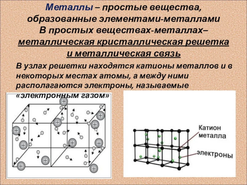 В узлах решетки находятся катионы металлов и в некоторых местах атомы, а между ними располагаются электроны, называемые «электронным газом»