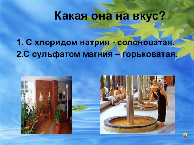 Какая она на вкус?1. С хлоридом натрия - солоноватая.2.С сульфатом магния – горьковатая.