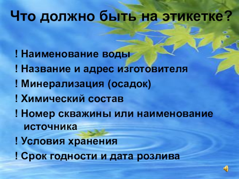 Что должно быть на этикетке?! Наименование воды! Название и адрес изготовителя! Минерализация (осадок)! Химический состав! Номер скважины
