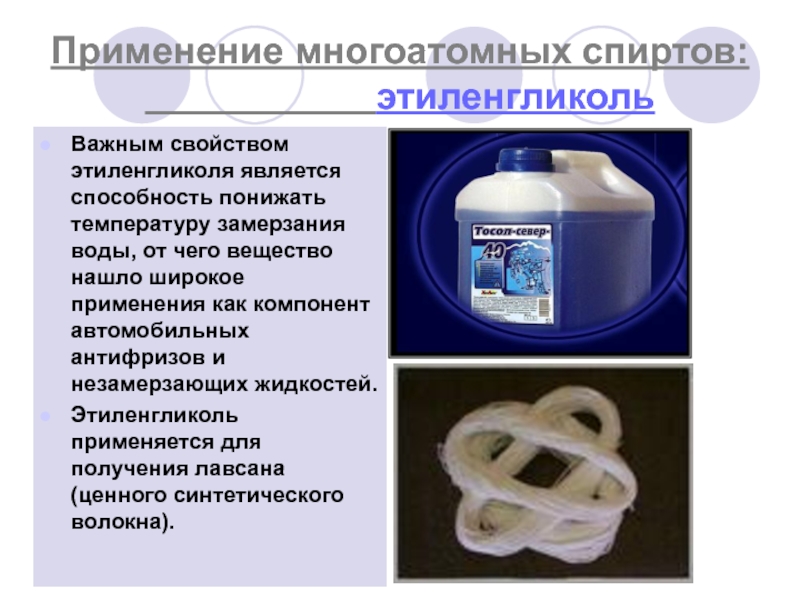 Этиленгликоль применяется для получения лавсана (ценного синтетического волокна).
