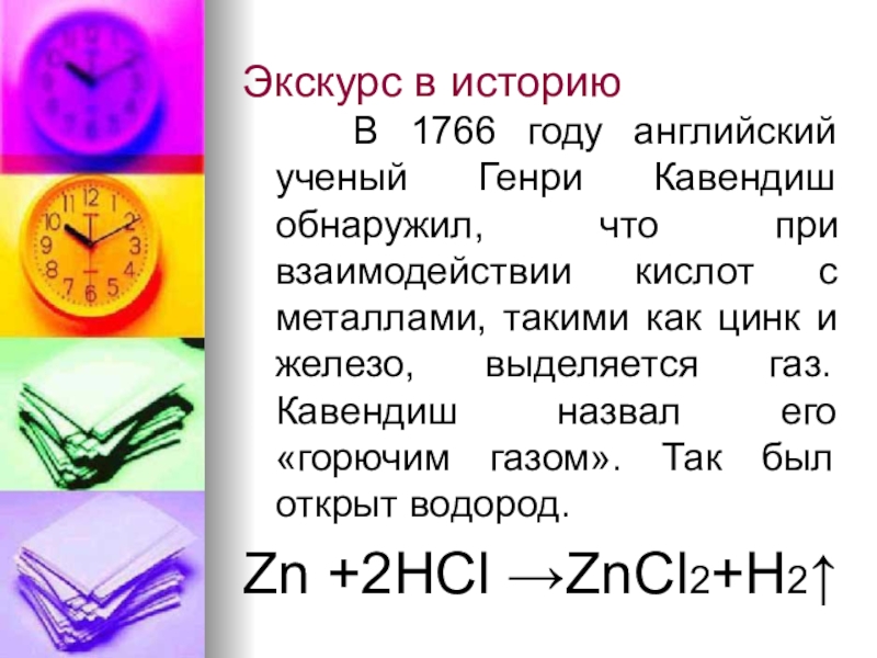 Экскурс в историю  В 1766 году английский ученый Генри Кавендиш обнаружил, что при взаимодействии кислот с