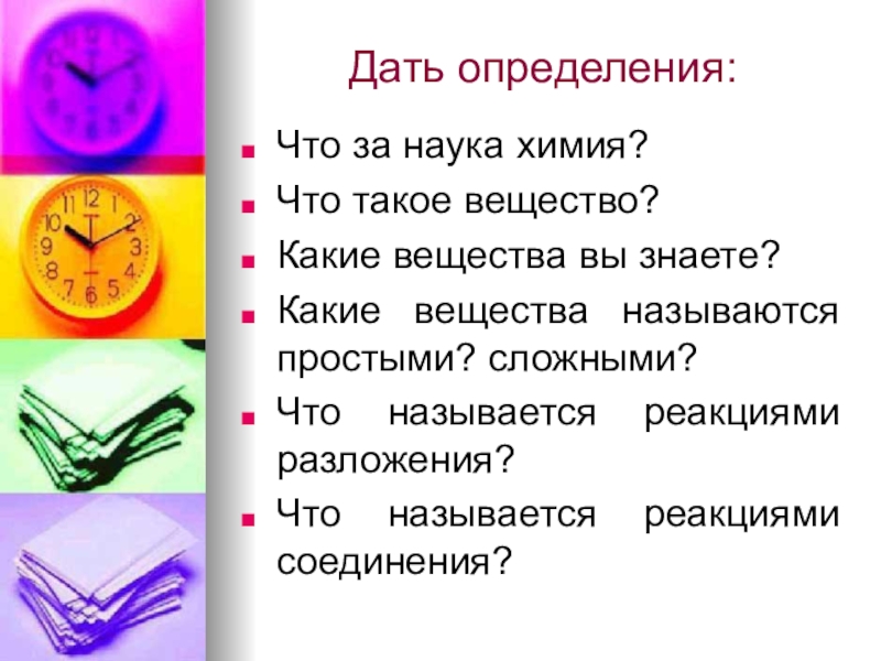 Дать определения:Что за наука химия?Что такое вещество?Какие вещества вы знаете?Какие вещества называются простыми? сложными?Что называется реакциями разложения?Что