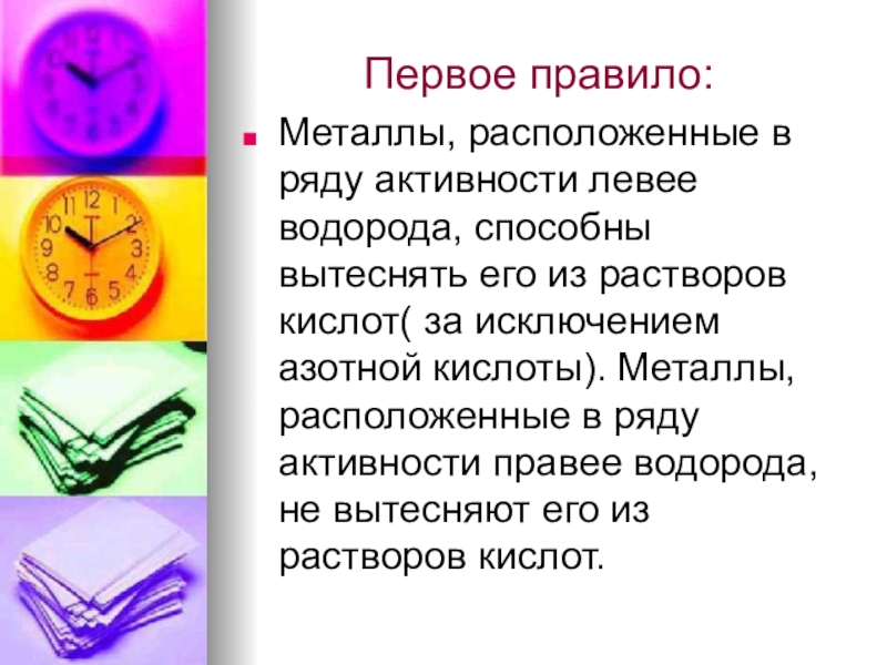 Первое правило:Металлы, расположенные в ряду активности левее водорода, способны вытеснять его из растворов кислот( за исключением азотной