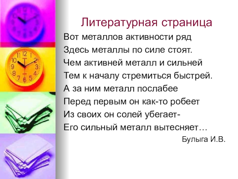 Литературная страницаВот металлов активности ряд Здесь металлы по силе стоят.Чем активней металл и сильней Тем к началу