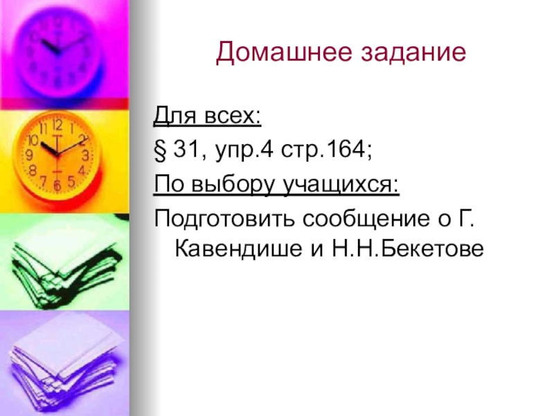 Домашнее заданиеДля всех:§ 31, упр.4 стр.164;По выбору учащихся:Подготовить сообщение о Г.Кавендише и Н.Н.Бекетове
