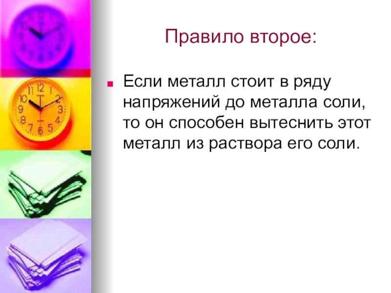 Правило второе:Если металл стоит в ряду напряжений до металла соли, то он способен вытеснить этот металл из раствора