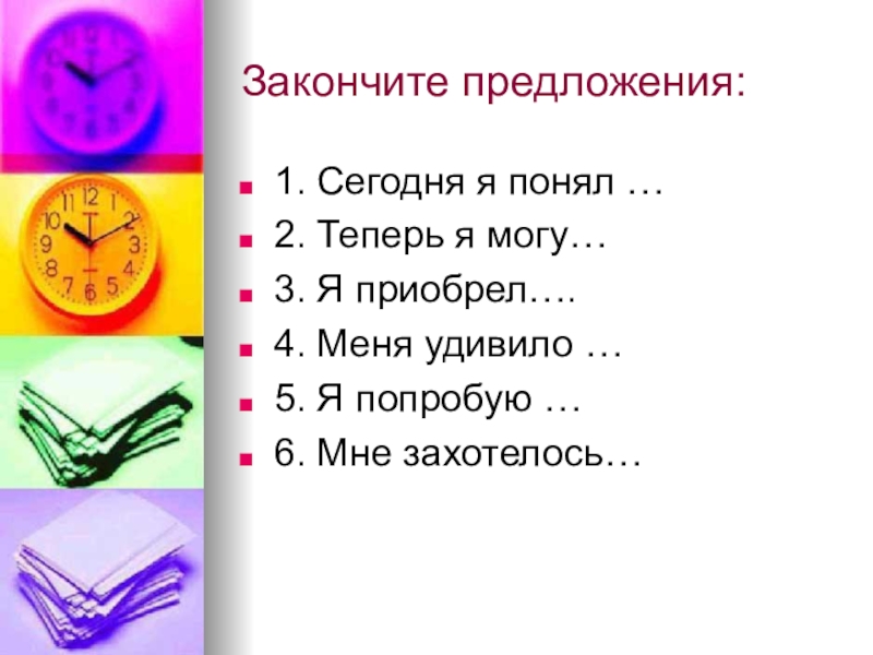 Закончите предложения:1. Сегодня я понял …2. Теперь я могу…3. Я приобрел….4. Меня удивило …5. Я попробую …6.
