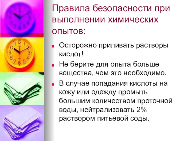 Правила безопасности при выполнении химических опытов:Осторожно приливать растворы кислот!Не берите для опыта больше вещества, чем это необходимо.В