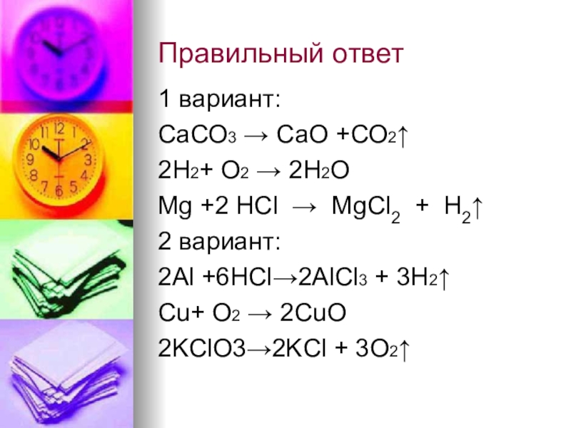 Правильный ответ1 вариант:СаСО3 → СаО +СО2↑ 2Н2+ О2 → 2Н2ОМg +2 НСl  →  МgCl2  +  H2↑2 вариант:2Al