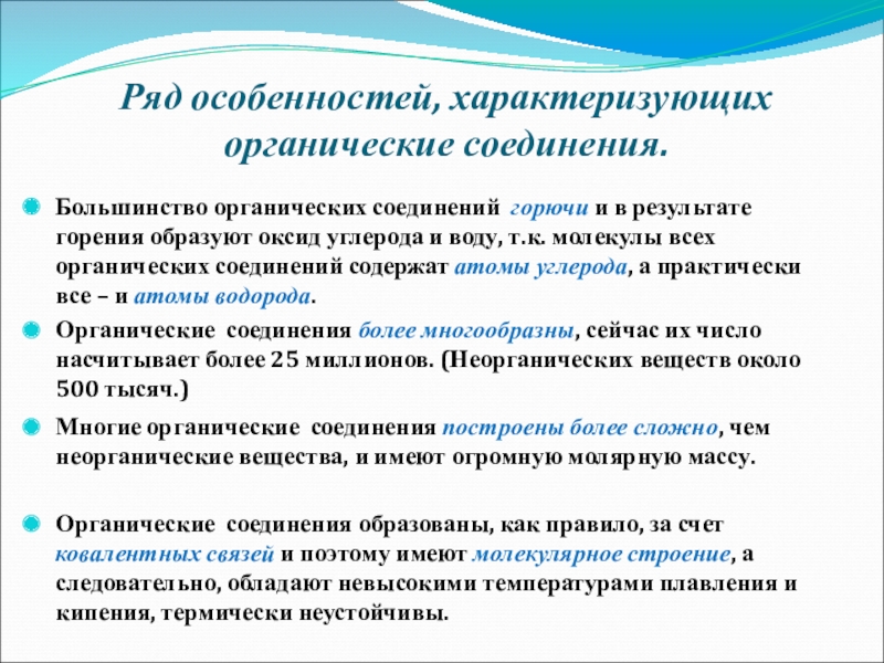 Органические соединения образованы, как правило, за счет ковалентных связей и поэтому имеют молекулярное строение, а следовательно, обладают невысокими температурами плавления и кипения, термически неустойчивы.