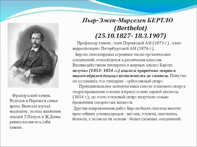 Французский химик. Родился в Париже в семье врача. Вначале изучал медицину, но под влиянием лекций Т.Пелуза и Ж.Дюма решил посвятить себя химии.