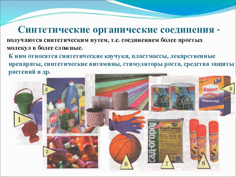 К ним относятся синтетические каучуки, пластмассы, лекарственные препараты, синтетические витамины, стимуляторы роста, средства защиты растений и др.